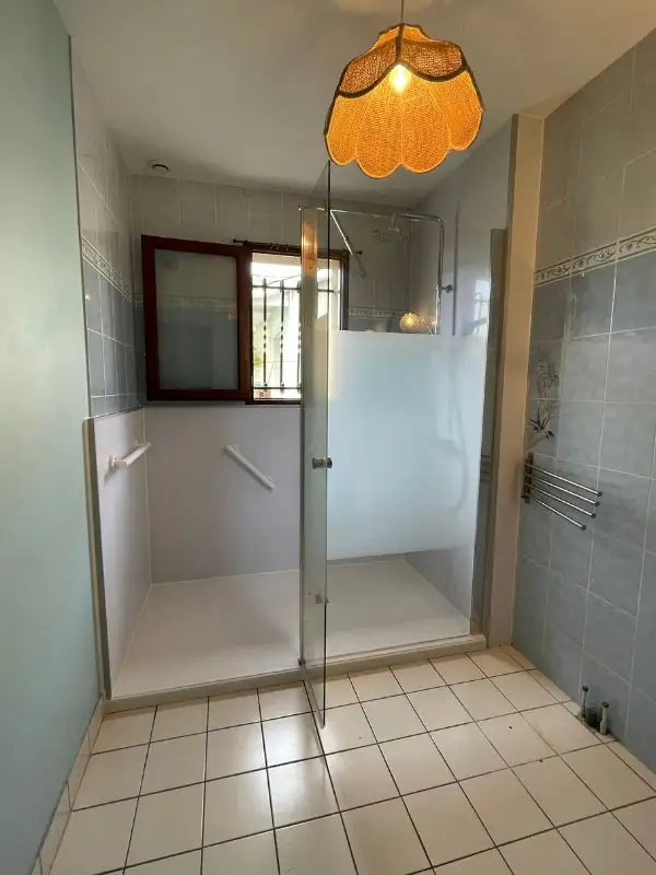 Rénovation pour cette salle de bain avec dépose de la baignoire en vue de la création d’un nouvel espace douche sécurisée avec la pose d’un receveur anti dérapant, reprise des murs par la pose de panneaux pvc blanc pour maintenir une étanchéité optimale, paroi fixe et son rabat pivotant, un siège pour plus de confort et de sécurité et on complète avec des barres.