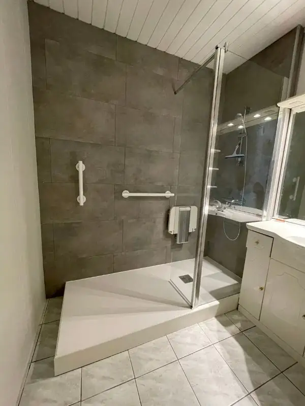 Dépose de la baignoire en vue de la création d’un espace douche sécurisée, pose d’un receveur PN24 anti dérapant, reprise des murs par la pose d’un revêtement mural type pierre gris, paroi fixe avec son rabat pivotant, pose d’un siège et de barres.
