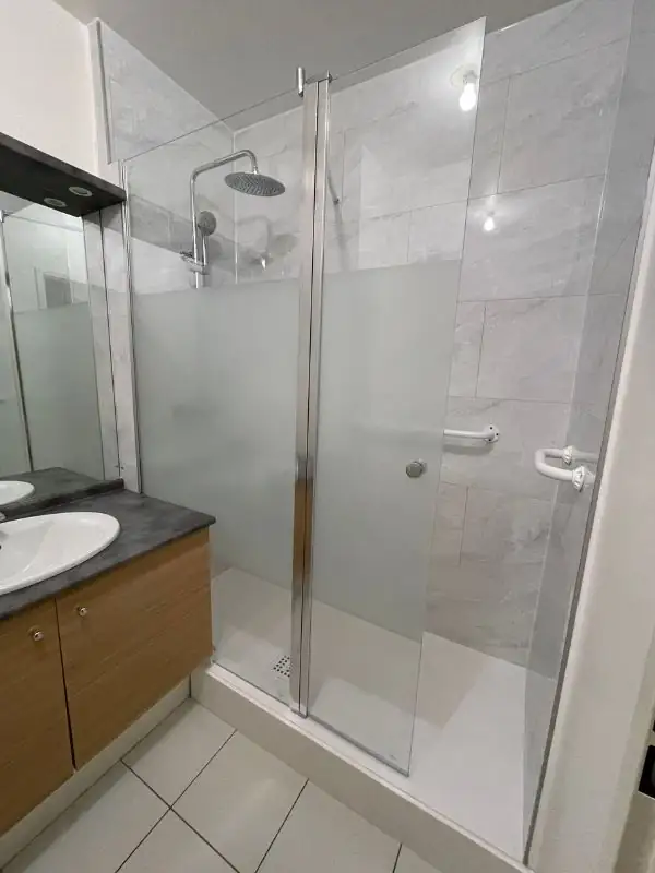 Dépose de la baignoire dans cet appartement en vue de la création d’un nouvel espace douche sécurisée avec la pose d’un receveur anti dérapant, reprise des murs par la pose de revêtement mural effet marbre brillant, paroi fixe et son rabat pivotant, un siège pour plus de confort et de sécurité et on complète avec des barres.