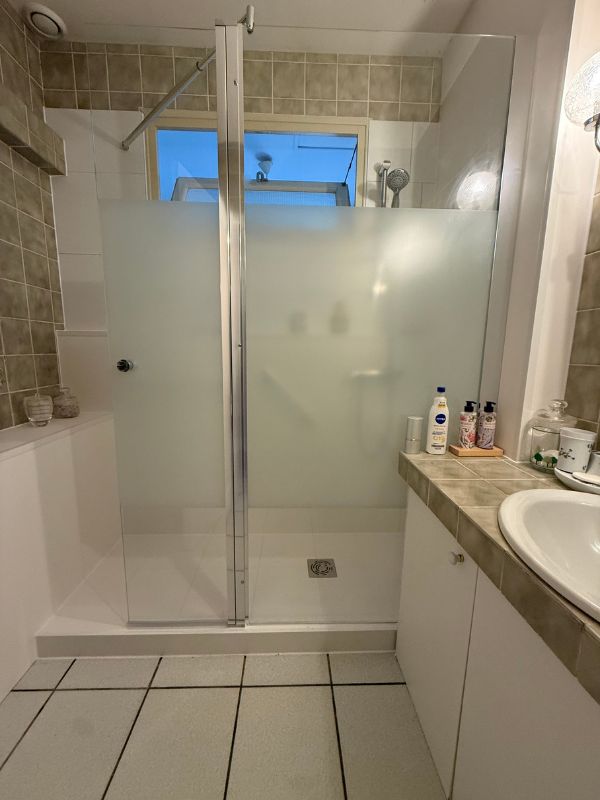 Pose d’un receveur extra plat blanc effet ardoise anti dérapant PN24, habillage mural blanc, pose d’une paroi vitrée avec rabat pivotant. Effet dépoli, pose de siège de douche rabattable et de plusieurs barres, pose conforme aux préconisations de l’ergothérapeute.