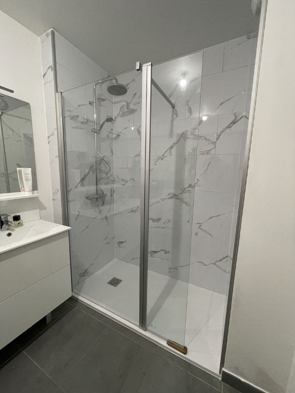 Pose d’un receveur extra plat ardoise blanc anti-dérapant, revêtement mural marbre gloss, paroi vitrée et rabat, pose d’une robinetterie thermostatique avec ciel de pluie