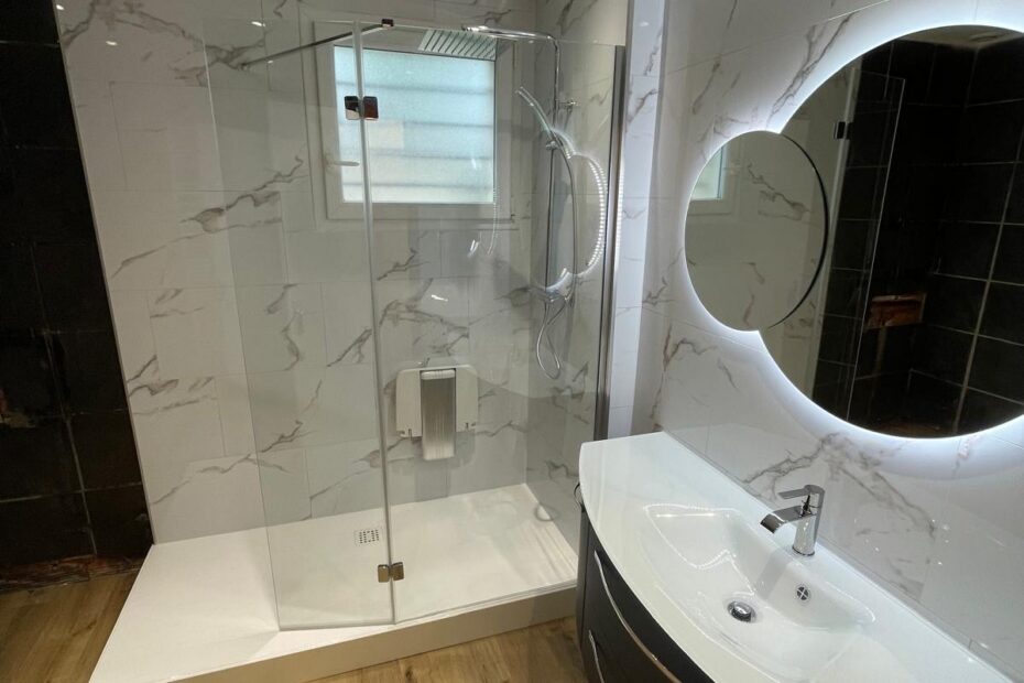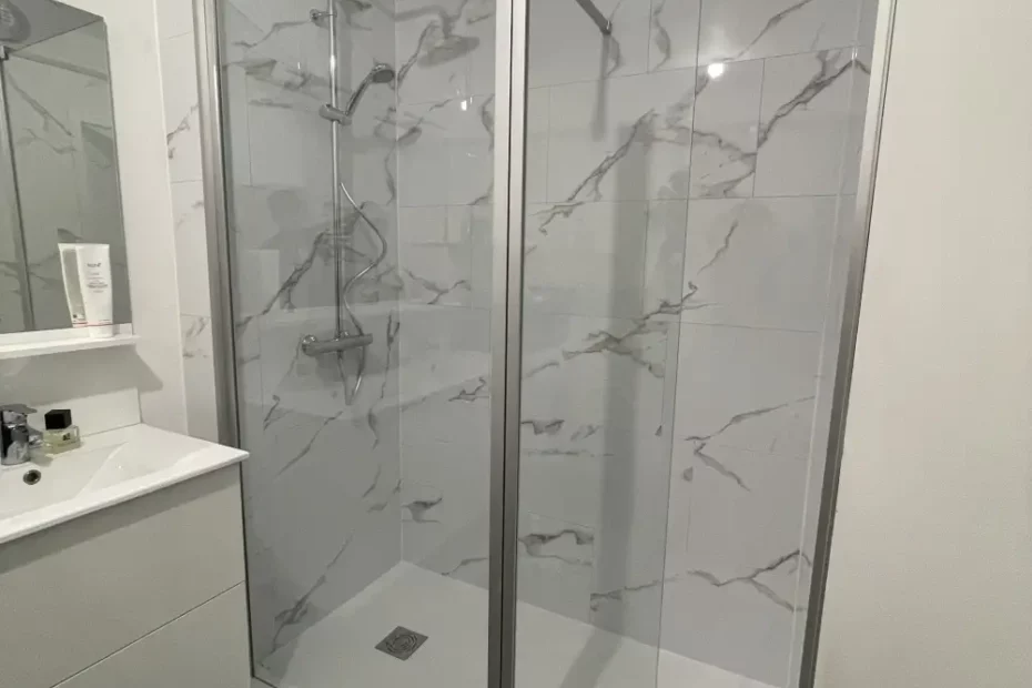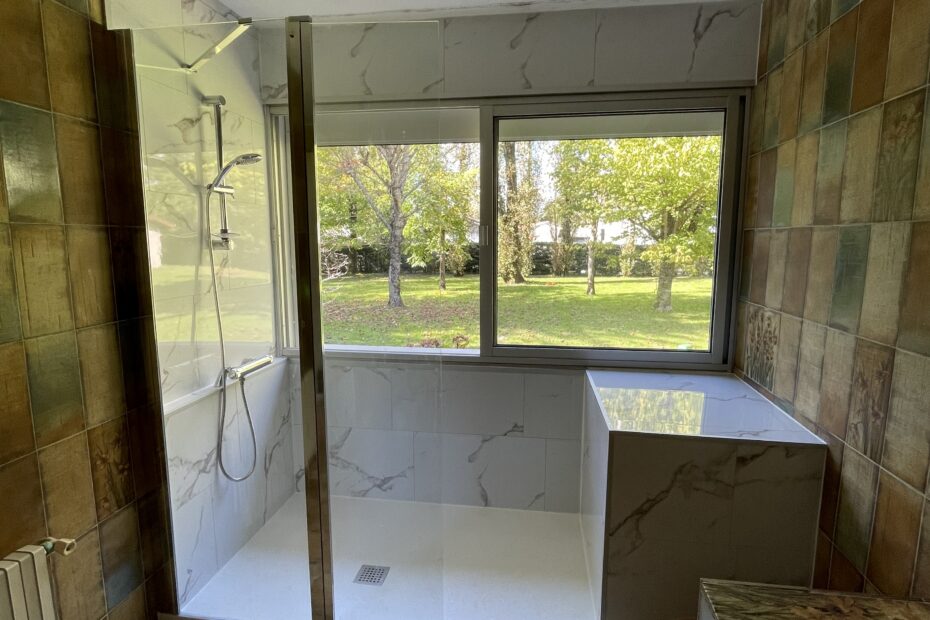 Dépose de la baignoire dans cet appartement en vue de la création d’un nouvel espace douche sécurisée avec la pose d’un receveur anti dérapant, reprise des murs par la pose de revêtement mural effet marbre brillant, paroi fixe et son rabat pivotant, un siège pour plus de confort et de sécurité et on complète avec des barres.