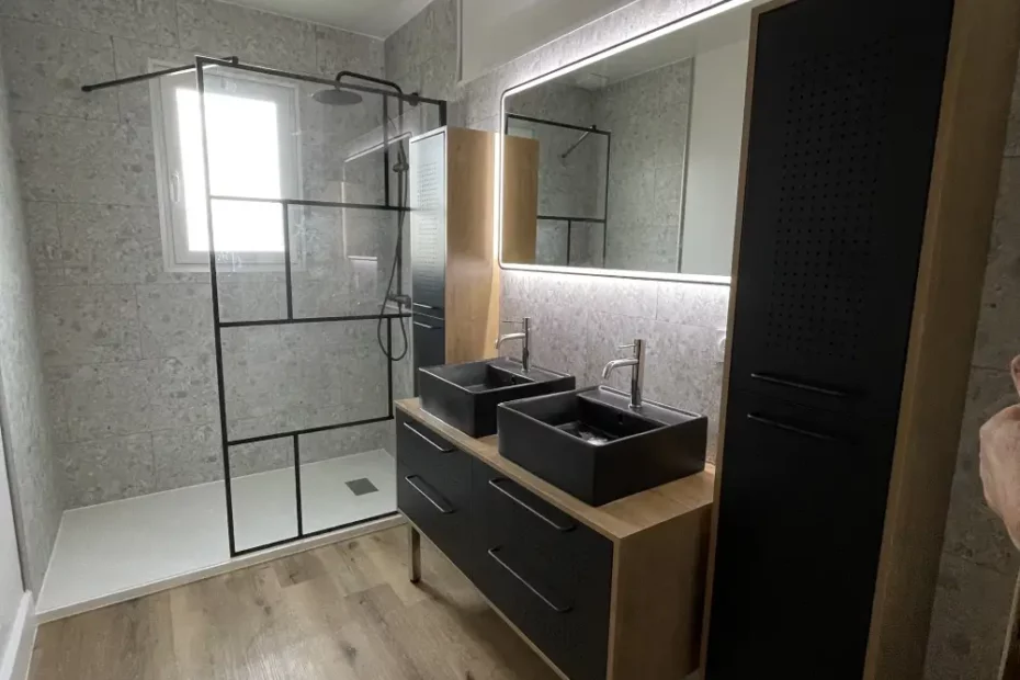 Reprise complète d’une salle de bain dans un appartement, dépose de tous les éléments, création d’un espace douche moderne, pose de revêtement mural et installation d’un nouvel ensemble meuble vasque et miroir.