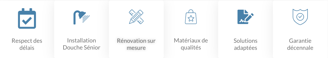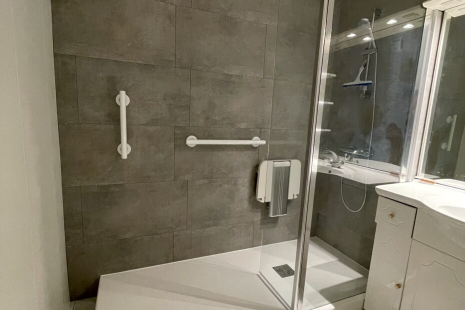 Dépose de la baignoire en vue de la création d’un espace douche sécurisée, pose d’un receveur PN24 anti dérapant, reprise des murs par la pose d’un revêtement mural type pierre gris, paroi fixe avec son rabat pivotant, pose d’un siège et de barres.