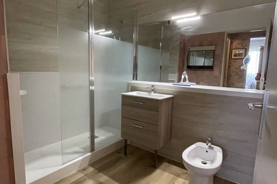Rénovation complète pour cette salle de bain avec dépose de la baignoire en vue de la création d’un nouvel espace douche sécurisée avec la pose d’un receveur anti dérapant, reprise des murs par la pose d’un revêtement mural type travertin, paroi fixe et son rabat pivotant, pose d’un sol anti-dérapant étanche effet plancher bois, pose d’un ensemble simple vasque, changement du bidet et pose d’un nouveau wc surélevé.