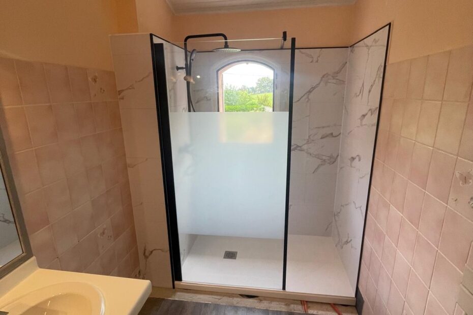 Dépose de la baignoire en vue de la création d’un espace douche, receveur PN24 anti dérapant, reprise des murs par la pose d’un revêtement mural effet marbre gloss, paroi fixe avec son rabat pivotant.