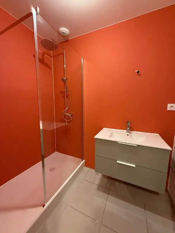 Sur la commune de Cavignac, nous avons réalisé la dépose de la baignoire en vue de la création d’un espace douche, receveur sur mesure effet ardoise blanc PN24 , reprise des murs par la pose d’un revêtement mural étanche couleur Terracota avec paroi fixe en 100 cmet colonne de douche thermostatique avec ciel de pluie.